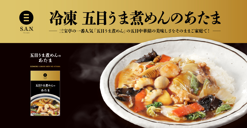 東京中目黒のお店で好評の「冷凍 酸辣湯麺」と「冷凍 全とろ麻婆麺®」、全店で人気No1の五目うま煮めんの中華餡を冷凍にした「五目うま煮めんのあたま」」と、新潟市の本社で熟練の職人が手造りし、作り立てをそのまま冷凍してお届けしています。職人の技と美味しさをぜひご家庭でお楽しみ下さい。さらに旨みがぎっしり詰まった大人気の三宝亭「冷凍餃子」もぜひどうぞ!